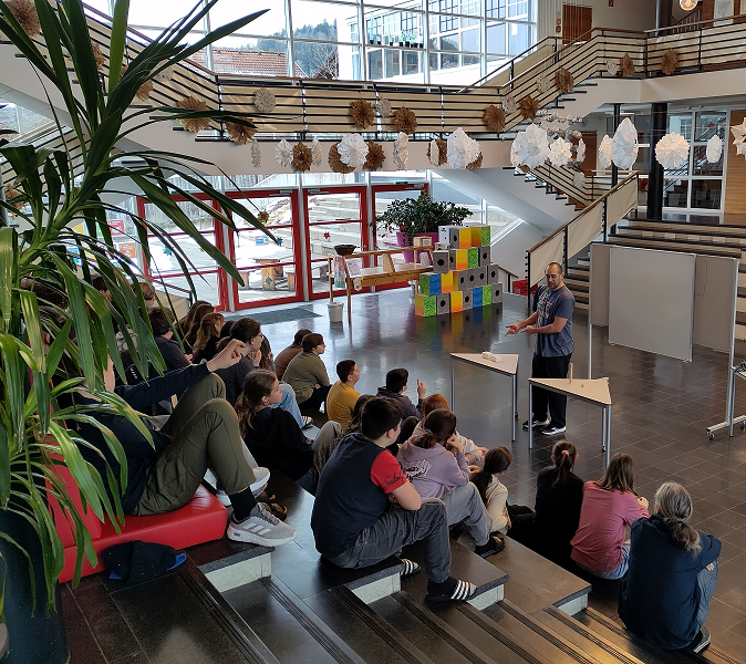 Heute fand in unserer Aula eine Präsentation zu den Gleichungen statt. Üblicherweise recht abstrakte Inhalte wurden sehr anschaulich und be-greifbar dargeboten.